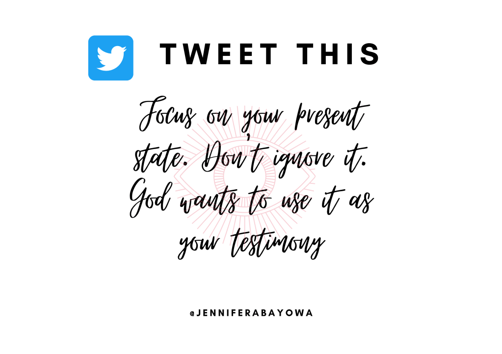 - How you need to focus on your present state and not ignore it, because it’s this present state that God wants to use as your testimony.